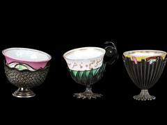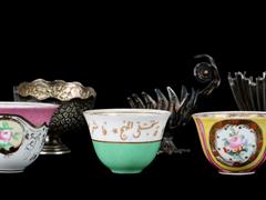 1 ADET ZARF TUĞRALI. TOPLAM 85 GR. 1 ADEDİ M.A İNİSİYALLİ. 1 ADET ZARF TELKARİ İŞÇİLİKLİ. FİNCANLAR ALTIN YALDIZ DEKORLU VE EL BOYAMA. 1 ADEDİ ESKİ TÜRKÇE YAZILI.
