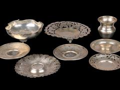 800 AYAR GÜMÜŞ DAMGALI 2 ADET ŞEKERLİK. ÇAP 12 - 15,5 CM. 1 ADET 900 AYAR GÜMÜŞ DAMGALI VAZO. H 6 CM. ÇAP 6 CM. 5 ADET GÜMÜŞ TABAK. 1 ADEDİ TUĞRALI . ÇAP 10 - 13 CM. TOPLAM AĞIRLIK 400 GR.