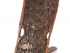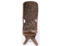20 YY. AFRİKA ETNİK SANATI. KAZIMA VE OYMA İŞÇİLİKLİ. ABANOZDAN MAMÜL. SIRT KISMI MUHTELİF FİGÜRLERLE DEKORLU. GEÇMELİ İKİ PARÇALI. 115X39X87 CM.
