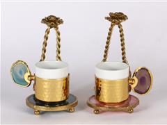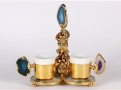 8 ADET PORSELEN FİNCAN. 8 ADET PİRİNÇ ZARF. TUTAMAK KISIMLARI DOĞAL TAŞ APLİKELİ.