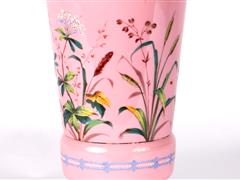 YUVARLAK KAİDE ÜZERİNE MONTELİ GÖVDE PEMBE ZEMİN ÜZERİ KUŞ VE RENKLİ ÇİÇEKLERLE EL DEKORLU. H 28 CM. ÇAP 13 CM.