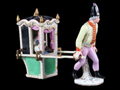 TAHTIREVAN VE TAŞIYICISI. TAHTIREVAN İÇİNDE KADIN VE KÖPEK FİGÜRLÜ. EL BOYAMA VE ALTIN YALDIZ DEKORLU. H 12 CM.