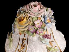 İMALAT DAMGALI. 4 AYAKLI KAİDE ÜZERİNE MONTELİ, GÖVDE, KAPAK VE TUTAMAK KISIMLARI KABARTMA ÇİÇEKLER İLE APLİKELİ. ALTIN YALDIZ DEKORLU. H 44 CM.
