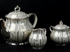 İTALYAN. VERBANO LAVENO İMALAT DAMGALI. DEMLİK, SÜTLÜK VE ŞEKERLİK. TÜM YÜZEYLER GÜMÜŞ SIVAMA TEKNİĞİ İLE ZARİF FLORAL DESENLER İLE DEKORLU.