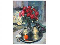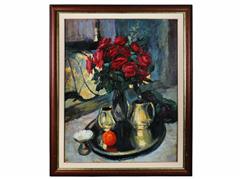 RUS EKOLÜ.VAZODA ÇİÇEKLER.TUAL ÜZERİ YAĞLIBOYA. ARKADA İMZALI. 90X70 CM.