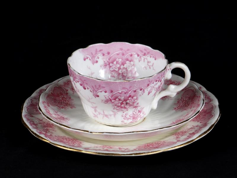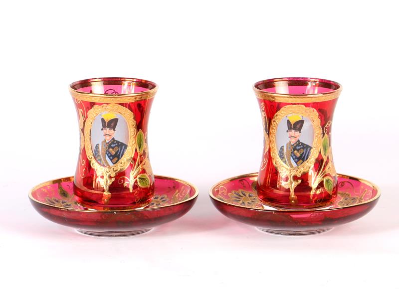 BARDAK ÜZERİ MADALYONLU İÇİ PORTRELİ. TABAK VE BARDAK ALTIN VERMEYLİ. RENKLİ ÇİÇEKLERLE EL DEKORLU.