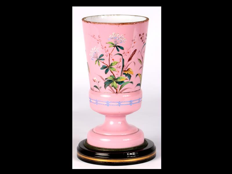 YUVARLAK KAİDE ÜZERİNE MONTELİ GÖVDE PEMBE ZEMİN ÜZERİ KUŞ VE RENKLİ ÇİÇEKLERLE EL DEKORLU. H 28 CM. ÇAP 13 CM.