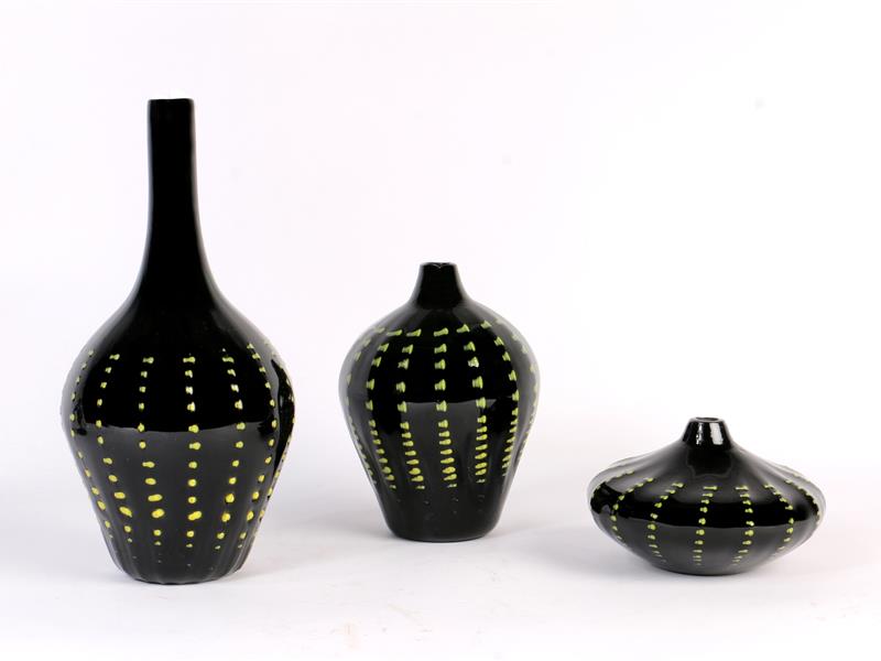 FARKLI FORMLARDA. SİYAH RENKLİ GÖVDE ÜZERİ SARI MOTİFLERLE DEKORLU. H 8-19-29 CM.