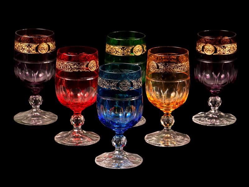 KESME KRİSTAL. MUHTELİF RENKLİ. AĞIZ KISMINA YAKIN KALEM İŞÇİLİKLİ, ALTIN YALDIZ DEKORLU. H 12 CM.