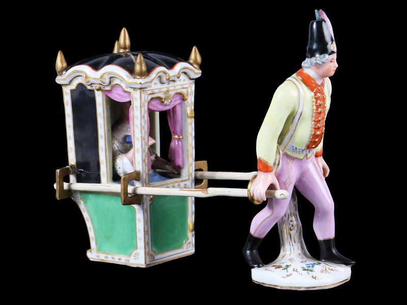 TAHTIREVAN VE TAŞIYICISI. TAHTIREVAN İÇİNDE KADIN VE KÖPEK FİGÜRLÜ. EL BOYAMA VE ALTIN YALDIZ DEKORLU. H 12 CM.