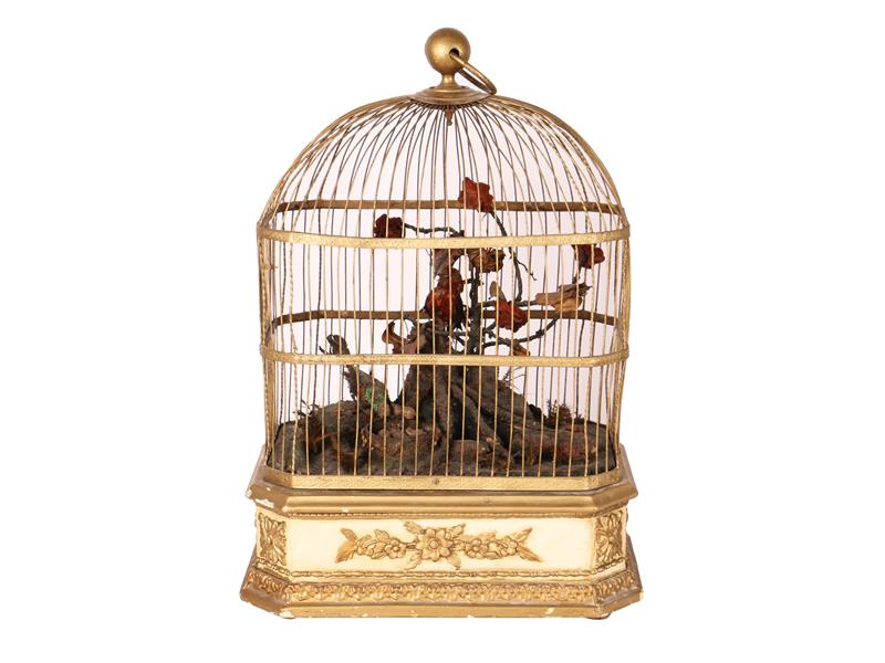 FRANSIZ. CİRCA 1900. BONTEMS. 2 BÜYÜK 3 YAVRU KUŞ KAFESİ OTOMATI. KAFALARI VE KUYRUKLARI YANARDÖNER YEŞİL, KIRMIZI TÜYLERİ OLAN İKİ DALDA TÜNEMİŞ KUŞ VE 3 ADET YUVADA BULANAN YAVRU KUŞ. PAPİE MACHEDEN YAPILMIŞ YANLARDA, KÖŞEDE ÇİÇEK YAPRAK VE DALLARLA DAN OLUŞAN ANA GÖVDE ALTIN YALDIZ BORDÜRLÜ ZEMİNE MONTE EDİLMİŞ KAFES PİRİNÇ TELLER İLE ÇEVRİLİDİR. ANA GÖVDE VE KAFA HAREKETİ İLE KAFALARI HARAKETLİ ANNE KUŞ YAVRU KUŞLARI BESLEMEKTEDİR. DİĞER KUŞUN KAFASI VE KUYRUĞU HAREKETLİDİR. BEYAZ RENKLİ AHŞAP AYAKLI ASKISI MEVCUTTUR. 55X40X26 CM. ASKI H 170 CM. ÇOK NADİR BULUNAN KOLEKSİYONLUK BİR ESERDİR.