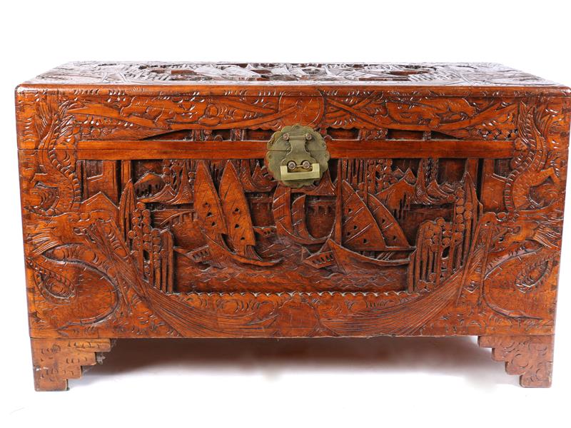 20. YY. UZAKDOĞU. KAFUR AĞACINDAN MAMÜL. EJDERHA, YELKENLİ, TEKNELER, BALIKÇILAR, FLORA VE FAUNA BETİMLEYEN SAHNELER İLE DEKORLU. SANDIK YANLARI OYMA KUŞLAR VE ÇİÇEKLER İLE DEKORLU. ÖZEL PİRİNÇ KİLİTLİ. İÇ KISMI HAREKETLİ TEPSİLİ. 101X50X59 CM.