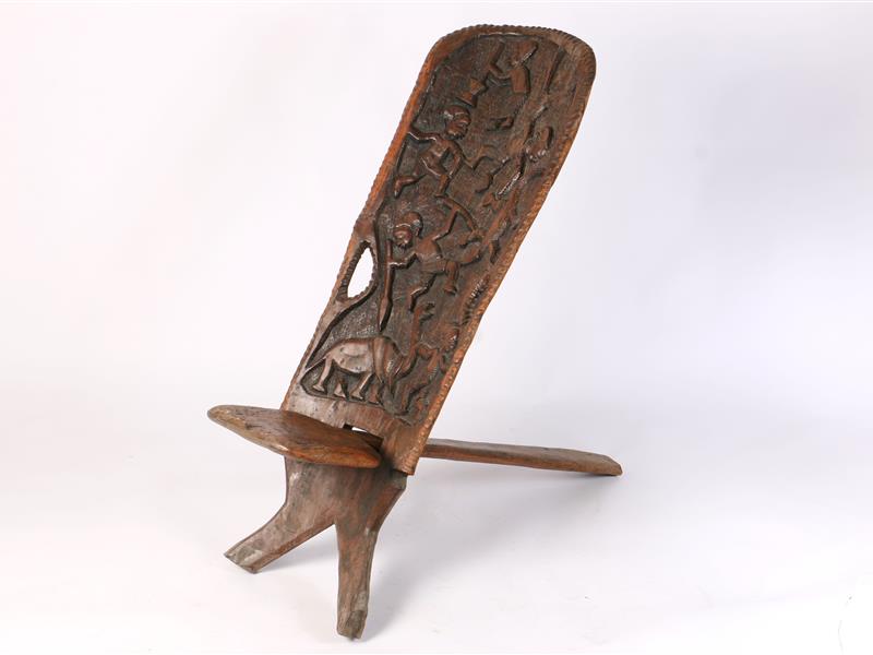 20 YY. AFRİKA ETNİK SANATI. KAZIMA VE OYMA İŞÇİLİKLİ. ABANOZDAN MAMÜL. SIRT KISMI MUHTELİF FİGÜRLERLE DEKORLU. GEÇMELİ İKİ PARÇALI. 115X39X87 CM.