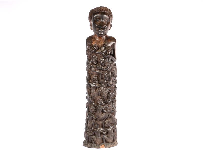 20 YY. AFRİKA ETNİK SANATI. KAZIMA VE OYMA İŞÇİLİKLİ. ABANOZDAN MAMÜL. FİGÜRLERLE DEKORLU. AĞIRLIK 2,58 KG. H 49 CM.