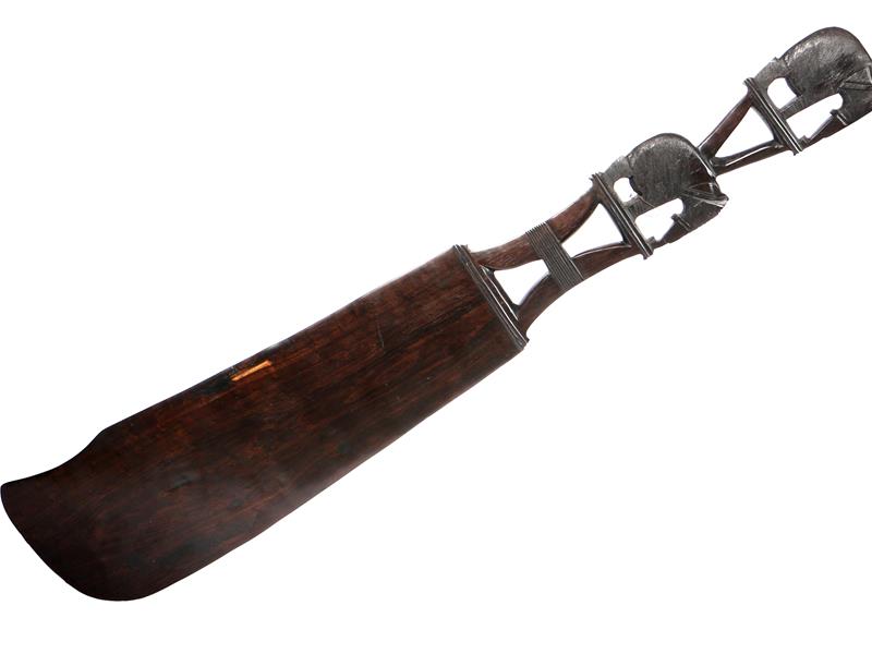 20 YY. AFRİKA ETNİK SANATI. KAZIMA VE OYMA İŞÇİLİKLİ. ABANOZDAN MAMÜL. TUTAMAK KISMI FİL FİGÜRLÜ. 103X18 CM.