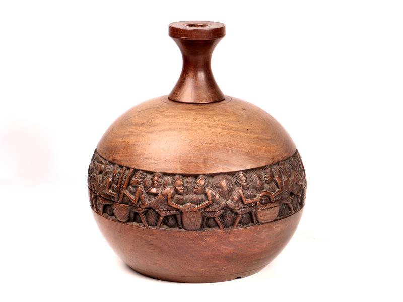 20 YY. AFRİKA ETNİK SANATI. KAZIMA VE OYMA İŞÇİLİKLİ. TÜM GÖVDE AFRİKA YERLİ FİGÜRLERİ İLE DEKORLU. ABANOZDAN MAMÜL. AĞIRLIK 2,3 KG. ÇAP 29 CM. H 12 CM.