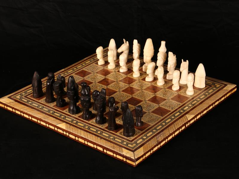 SATRANÇ TAŞLARI FİL DİŞİ VE ABANOZ AĞACINDAN MAMÜL. SATRANÇ TAHTASI SEDEF VE KEMİK KAKMALI. 40X40 CM. AYRICA SEDEF VE KEMİK KAKMALI KUTUSU MEVCUT. 26X16X7 CM.
