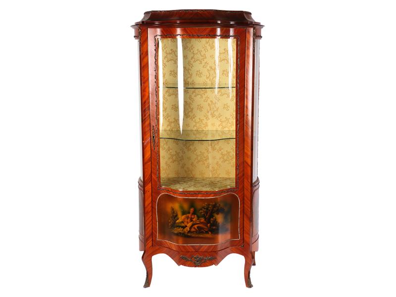 FRANSIZ. VOLANLI BOMBE CAMLI TEK KAPILI. 2 CAM RAFLI. KAPI ÜZERİ VE YAN TARAFLARI EL BOYAMA PEYZAJ DEKORLU. BRONZ APLİKELİ. 160X77X48 CM.
