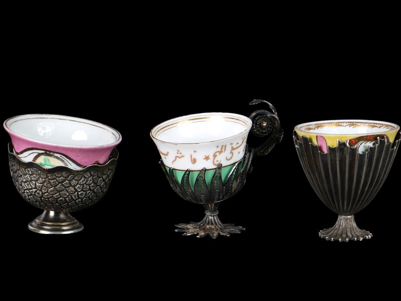 1 ADET ZARF TUĞRALI. TOPLAM 85 GR. 1 ADEDİ M.A İNİSİYALLİ. 1 ADET ZARF TELKARİ İŞÇİLİKLİ. FİNCANLAR ALTIN YALDIZ DEKORLU VE EL BOYAMA. 1 ADEDİ ESKİ TÜRKÇE YAZILI.