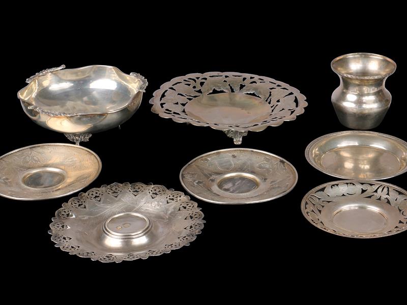 800 AYAR GÜMÜŞ DAMGALI 2 ADET ŞEKERLİK. ÇAP 12 - 15,5 CM. 1 ADET 900 AYAR GÜMÜŞ DAMGALI VAZO. H 6 CM. ÇAP 6 CM. 5 ADET GÜMÜŞ TABAK. 1 ADEDİ TUĞRALI . ÇAP 10 - 13 CM. TOPLAM AĞIRLIK 400 GR.