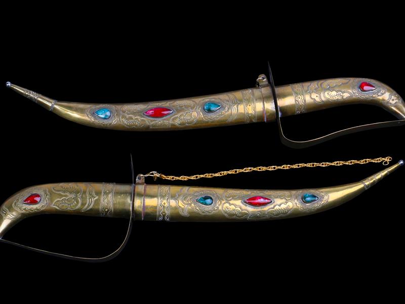 PİRİNÇ. KALEM İŞÇİLİKLİ. ÜZERİ RENKLİ TAŞLARLA APLİKELİ. UZ 38 CM.