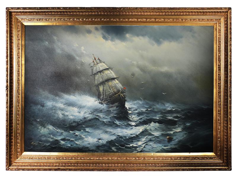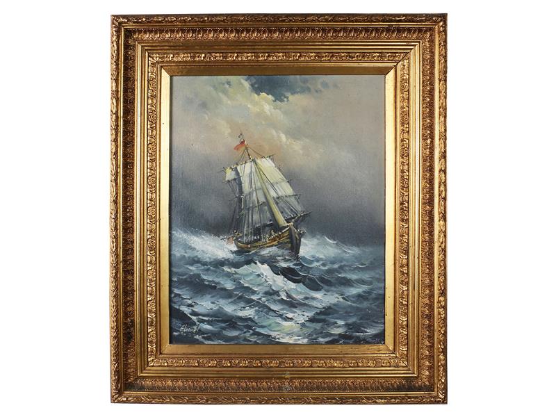 FIRTINALI DENİZDE GEMİ. TUAL ÜZERİ YAĞLIBOYA. AHMET İMZALI. 80X120 CM.