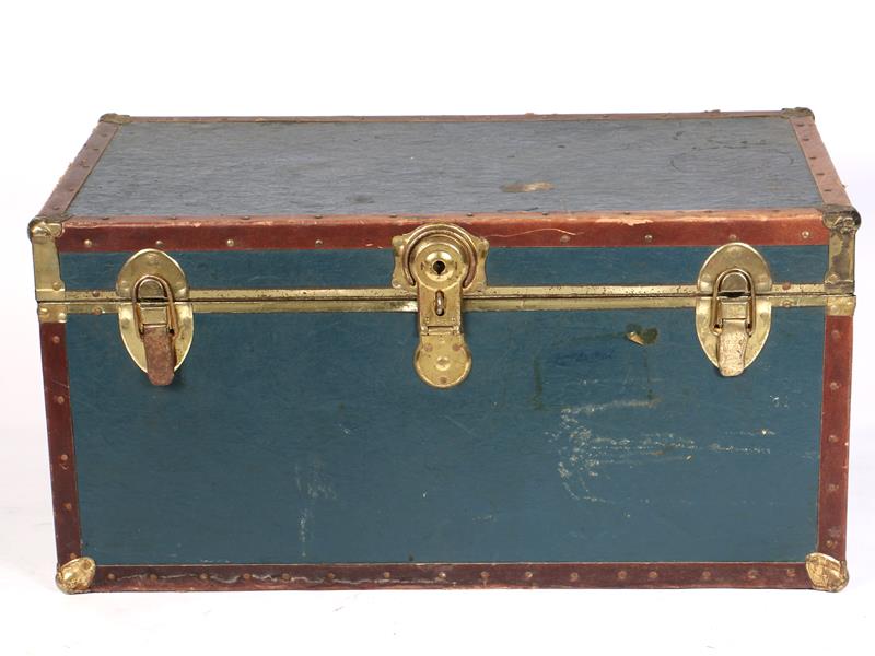 DERİ KAPLI. PİRİNÇ KİLİTLİ VE YAN TARAFLARI DERİ TUTAMAKLI. 78X42X39 CM.