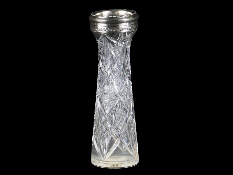 RUS. KESME KRİSTAL. AĞIZ KISMI GÜMÜŞ GEÇMELİ. 84 GÜMÜŞ DAMGALI. H 22 CM. ÇAP 6,5 CM.