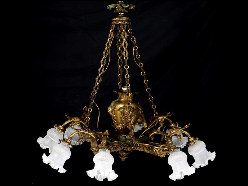 4 KOLLU, 9 LAMBALI. KABARTMA FİGÜRLERLE DEKORLU. H 73 CM.