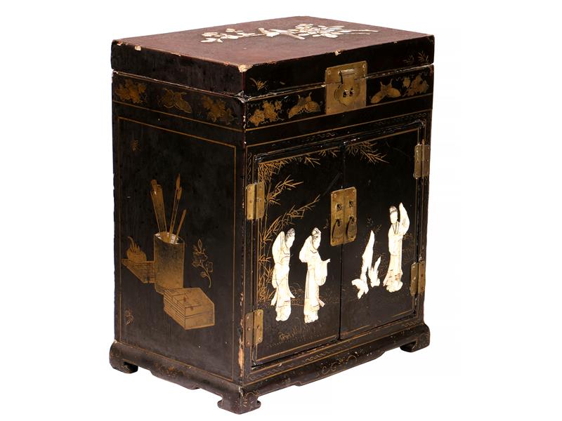 20 YY. UZAK DOĞU. ÜST VE ÖN KAPAKLAR KEMİK VE FİLDİŞİ APLİKELİ. ÜSTE AÇILIR TEK, ÖNDE İKİ KAPAKLI. 30.5X37X20 CM.