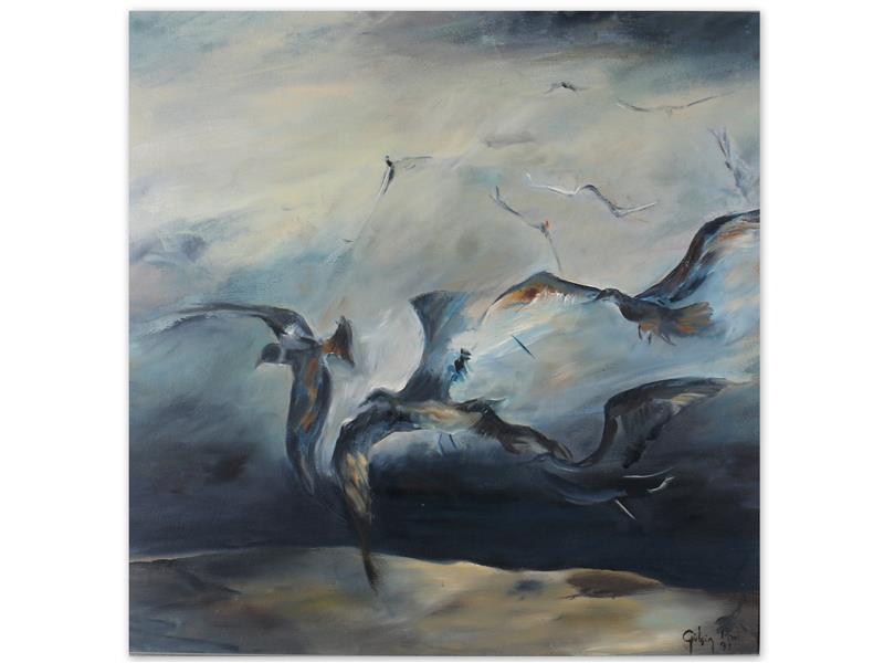 KUŞLAR. TUAL ÜZERİ YAĞLIBOYA. İMZALI. 1991 T. 60X60 CM.