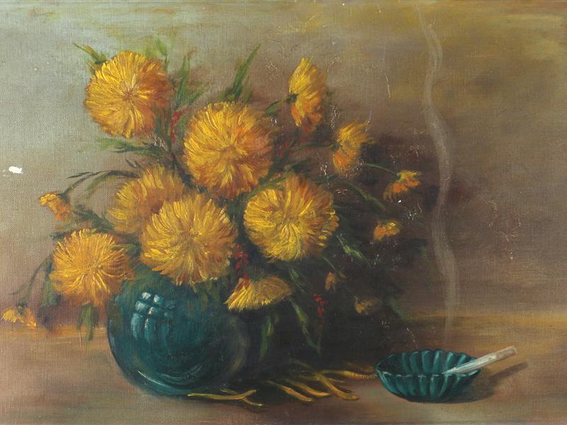 VAZODA ÇİÇEKLER. TUAL ÜZERİ YAĞLIBOYA. İMZASIZ. 40X56 CM.