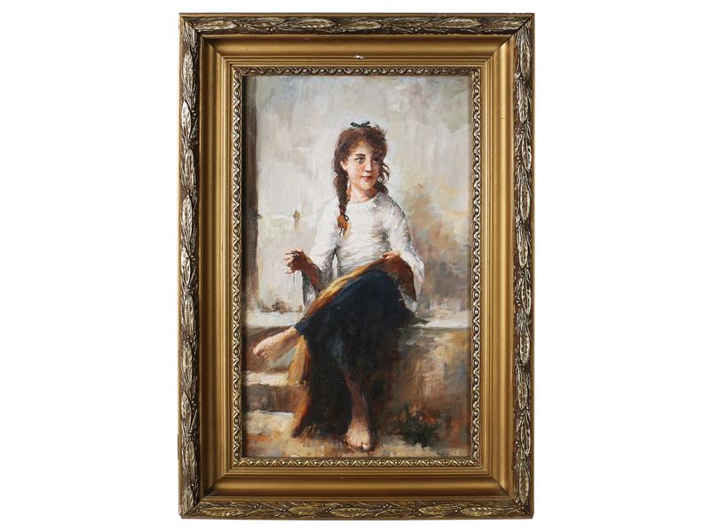 RUS EKOLÜ. DİKİŞ DİKEN KIZ. TUAL ÜZERİ YAĞLIBOYA. ARKADA İMZALI. 2001 T. 50X30 CM.