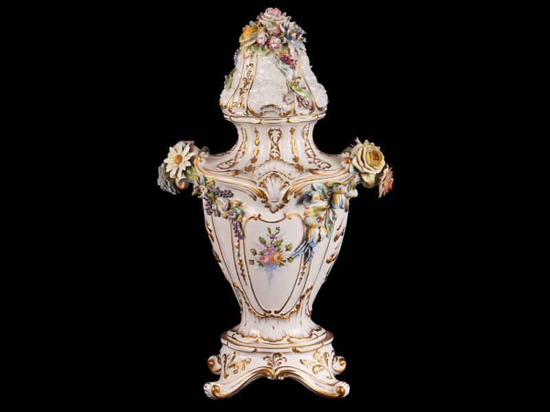 İMALAT DAMGALI. 4 AYAKLI KAİDE ÜZERİNE MONTELİ, GÖVDE, KAPAK VE TUTAMAK KISIMLARI KABARTMA ÇİÇEKLER İLE APLİKELİ. ALTIN YALDIZ DEKORLU. H 44 CM.