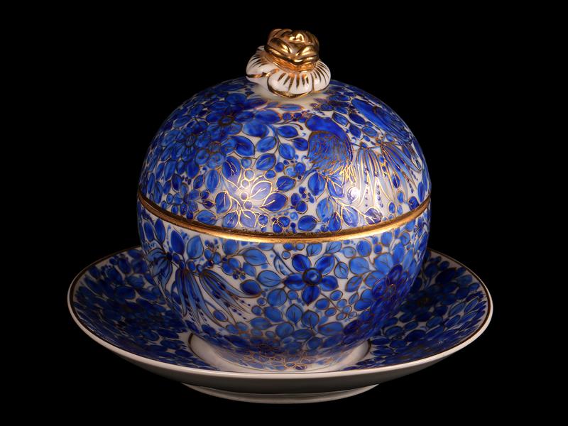 ESKİ HAREM PORSELEN. NİMET ELİŞİ İMZALI. 1986 T. BEYAZ RENKLİ GÖVDE ÜZERİ KOBALT ÇİÇEKLER VE ALTIN YALDIZ EL DEKORLU. KAPAK ÜZERİ TUTAMAK GÜL FORMLU. H 12 CM.