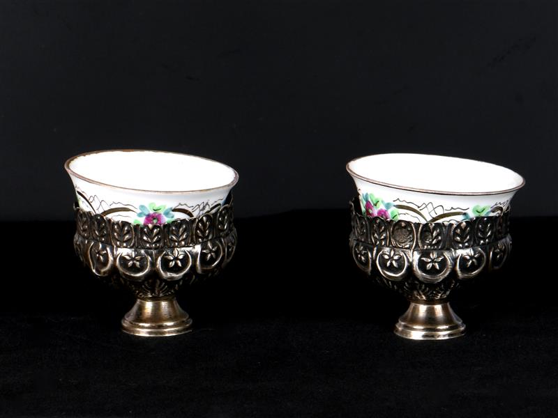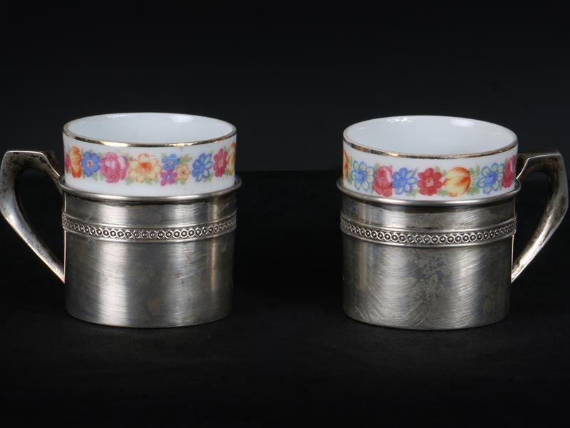 ZARFLAR TUĞRALI VE KALEM İŞÇİLİKLİ. TOPLAM AĞIRLIK 130 GR. 2 ADET FİNCAN RUS İMALAT DAMGALI. ALTIN YALDIZ DEKORLU. 2 FİNCAN ALTIN YALDIZ AY YILDIZ DEKORLU.