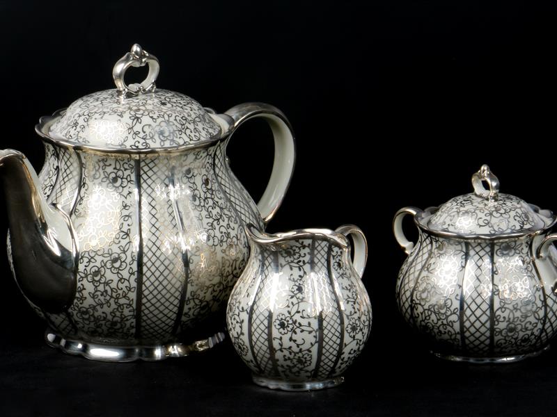 İTALYAN. VERBANO LAVENO İMALAT DAMGALI. DEMLİK, SÜTLÜK VE ŞEKERLİK. TÜM YÜZEYLER GÜMÜŞ SIVAMA TEKNİĞİ İLE ZARİF FLORAL DESENLER İLE DEKORLU.