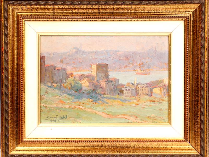 İSTANBUL DAN GÖRÜNÜM. DURALİT ÜZERİ YAĞLIBOYA. İMZALI. 1943 T. 19X27 CM.